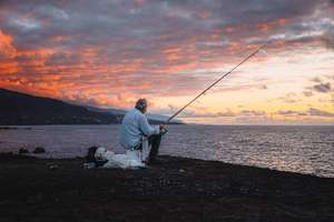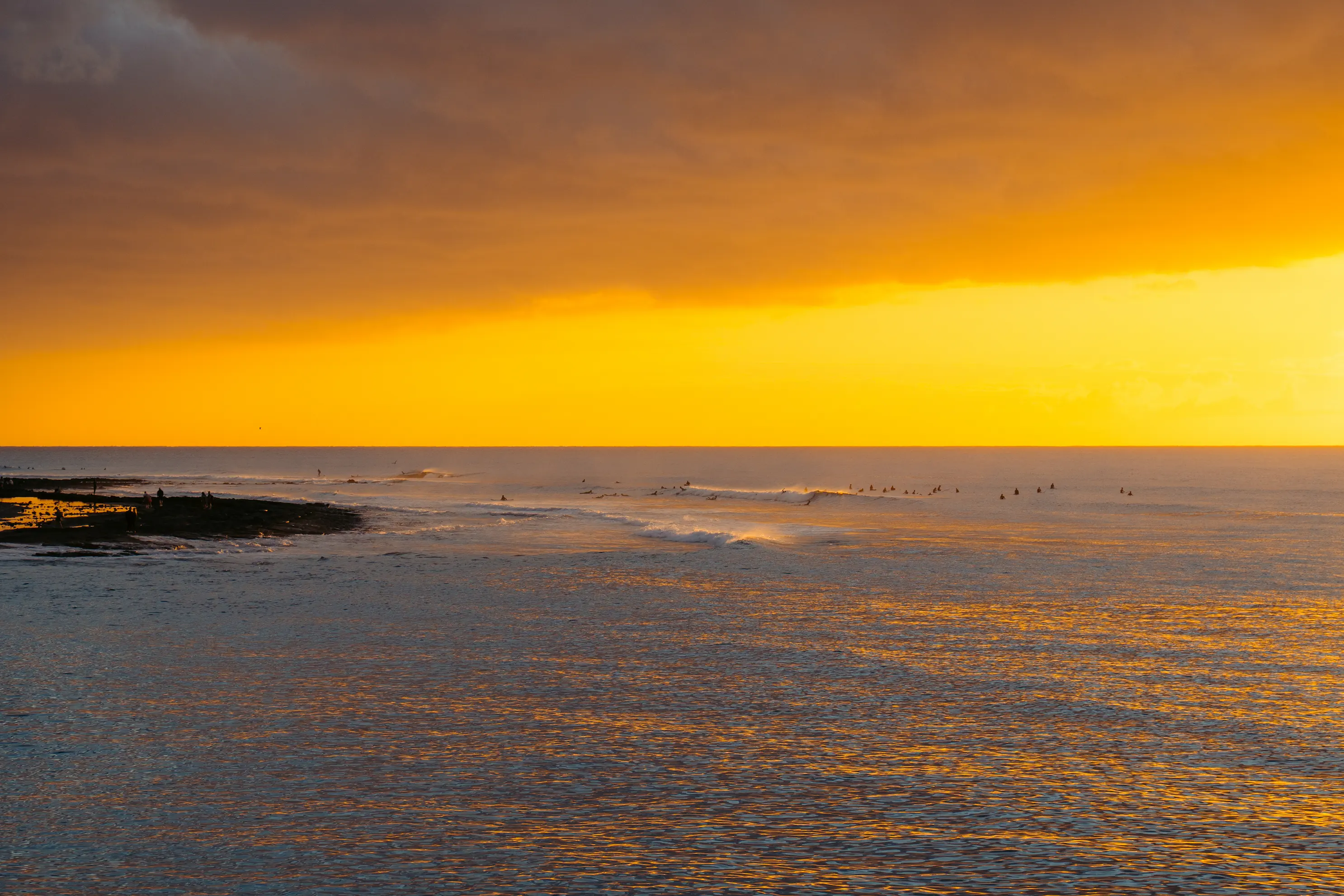 Surfaři ve vodě, vítr, nekonečný horizont.